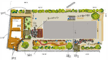 外構にも「手」をつけることになってしまったのだ。例によって「言いたい放題」が始まった。「基礎に石を貼リましょう。枕木、天然石、古レンガに耐火煉瓦。植栽もシンボルツリーに垣根になる植木を大小絡めて、、、、」「こんなのどうですか〜〜〜(上の絵)」と。