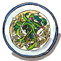 持ち帰って、ママさんにご披露。さぁ〜〜まずは、「キトピロラーメン」塩味にキトピロの新鮮なエキスが絡んだひき肉の油味?新玉ねぎ!キラキラのスープ!絶品なのです。どういうわけか?家の中ではなく外で、庭のガーデンテーブルで頂く「ならわし」となっている。
